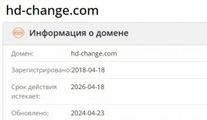 Далее мы решили проверить регистрационные данные домена hd-change.com, который на данный используется обменником. Выяснилось, что он был зарегистрирован в 2018 году. Однако последняя смена владельца произошла относительно недавно, а именно 23 апреля 2024 года. Подобные недолгосрочные проекты не вызывают доверия.